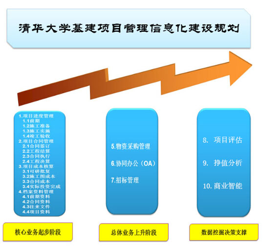 根據(jù)清華大學(xué)基建規(guī)劃處的業(yè)務(wù)的需求,合同規(guī)定購買的PM2模塊包括:協(xié)同辦公(OA)、項(xiàng)目進(jìn)度管理、物資采購管理、項(xiàng)目合同管理、成本投資管理、資金管理、招標(biāo)管理、檔案資料管理。此次實(shí)施采取的是:整體規(guī)劃、分步實(shí)施模式。