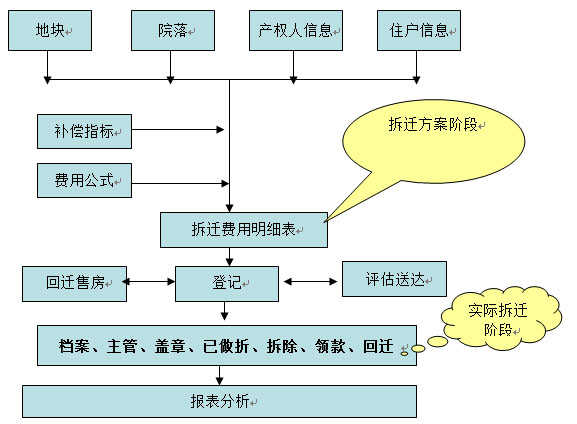 征地拆遷是市政建設(shè)和房地業(yè)務的龍頭,拆遷工作的順利與否,直接關(guān)系到后續(xù)開發(fā)工作的進展。總體業(yè)務流程如下: