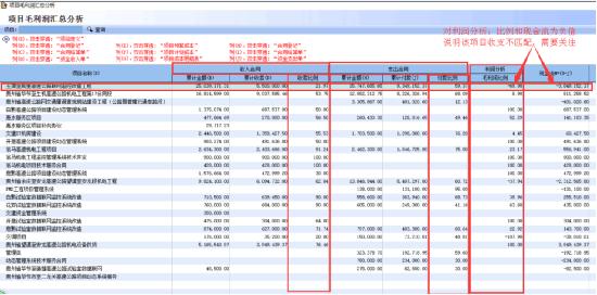2、項(xiàng)目毛利潤(rùn)分析匯總:通過(guò)該分析匯總表,可讓公司管控層了解全公司項(xiàng)目運(yùn)營(yíng)情況,通過(guò)項(xiàng)目的收、支兩條清淅的反饋出某項(xiàng)目的盈虧情況,對(duì)出現(xiàn)負(fù)數(shù)的毛利潤(rùn)比例項(xiàng)目進(jìn)行關(guān)注,該功能表還可以對(duì)每個(gè)數(shù)據(jù)項(xiàng)直接點(diǎn)擊進(jìn)行穿透性檢查,直接查找出數(shù)據(jù)的來(lái)源,檢查數(shù)據(jù)的準(zhǔn)確性、真實(shí)性。