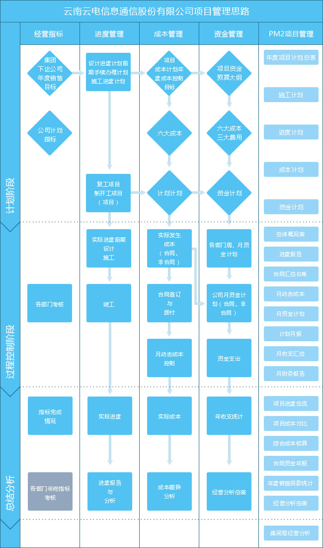 通過(guò)以上簡(jiǎn)單思路,通過(guò)PM2各子系統(tǒng)業(yè)務(wù)功能,實(shí)現(xiàn)項(xiàng)目開發(fā)全過(guò)程的控制,即前期有計(jì)劃、過(guò)程動(dòng)態(tài)控制、月終年終分析考核。
