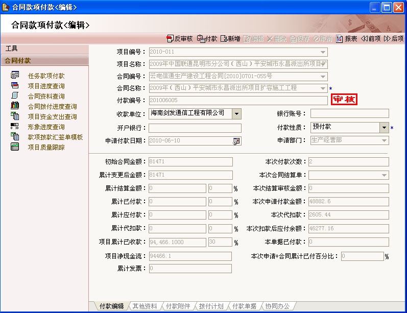 過(guò)程控制:進(jìn)度上報(bào),合同的簽訂、撥付、變更、簽證;