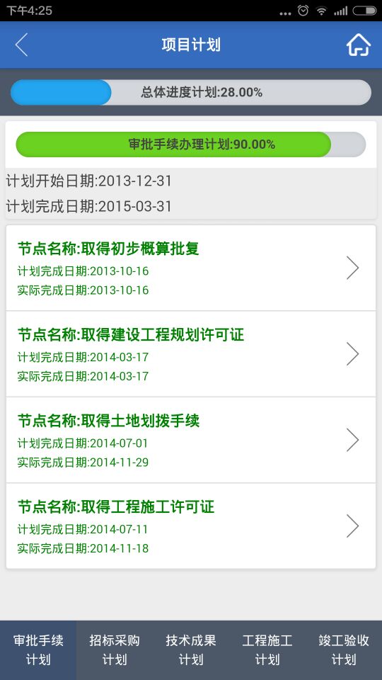 展示包括:總體進度計劃、審批手續(xù)辦理計劃、招標采購計劃、技術(shù)成果提交計劃、投資完成計劃、現(xiàn)場節(jié)點計劃及完成情況。