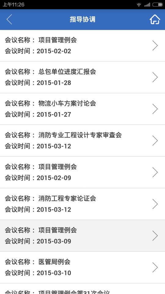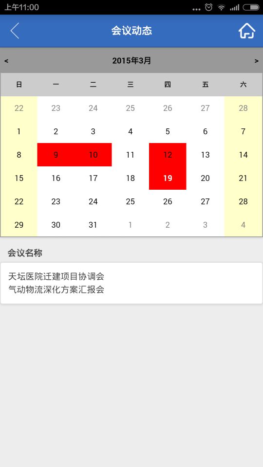 3)展示日歷模式會議日程安排,分主會和參會兩類:名稱、時間、地點及參加人,并注明狀態(tài):已開、待開或改期。