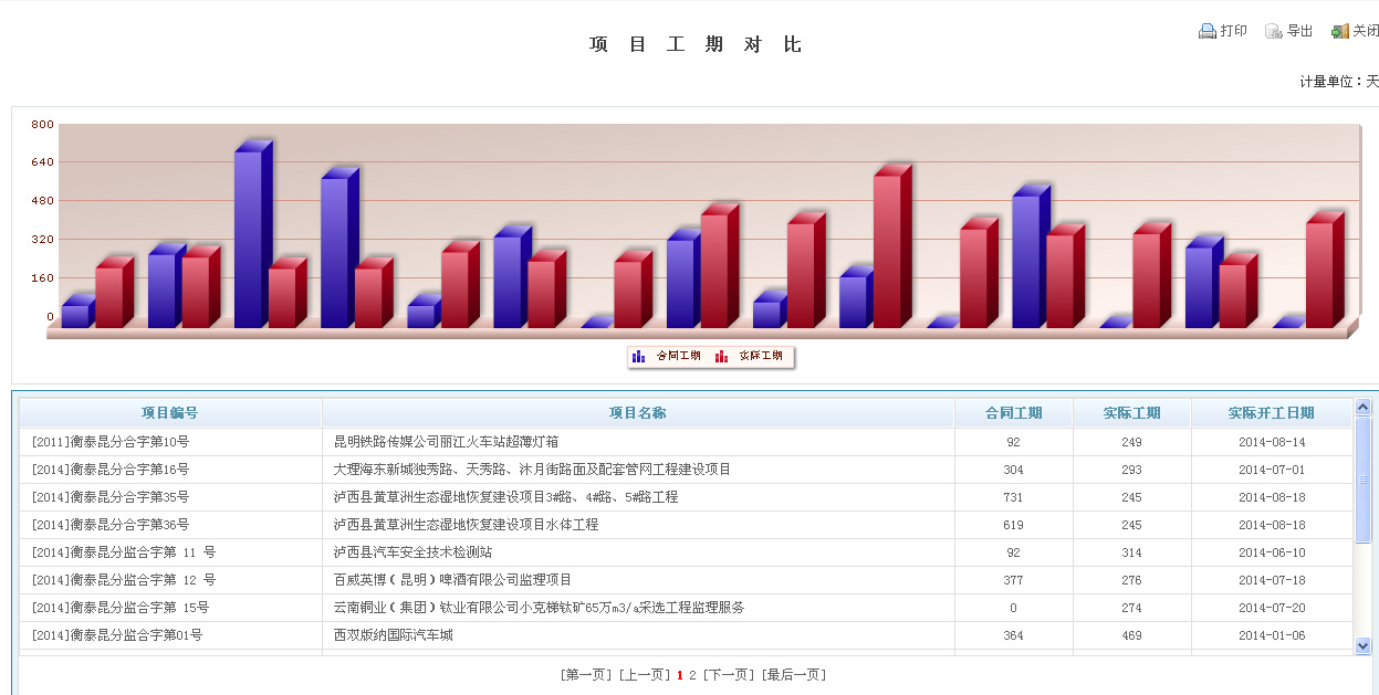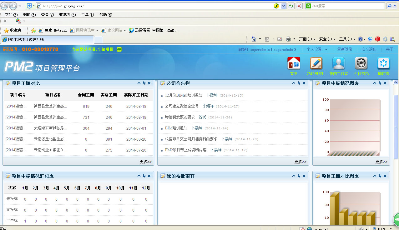 2014年12月30日云南廣泰工程項目管理有限公司根據(jù)業(yè)務(wù)發(fā)展及自身管理要求又提出深化應(yīng)用的需求,增加了項目風險管理以及領(lǐng)導管理決策分析,在系統(tǒng)中便捷展示了項目工期對比圖、項目中標情況匯總分析圖、項目運行情況分析圖、公司損益分析圖等一系列的分析圖表,實現(xiàn)了管理層決策的可視化,大大提升了公司的管理水平。