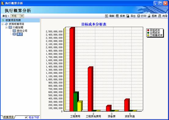 在項目的不同時期,按照建設(shè)項目、子項目、單項工程、單位工程、各專業(yè)分部分項工程進行分解及管理,實現(xiàn)投資控制。明確各個階段的增減內(nèi)容和投資變動以及各“算”間的相互差異,并根據(jù)項目建設(shè)管理需要,定期生成差異總表,分年投資計劃。如圖四執(zhí)行概算分析表。